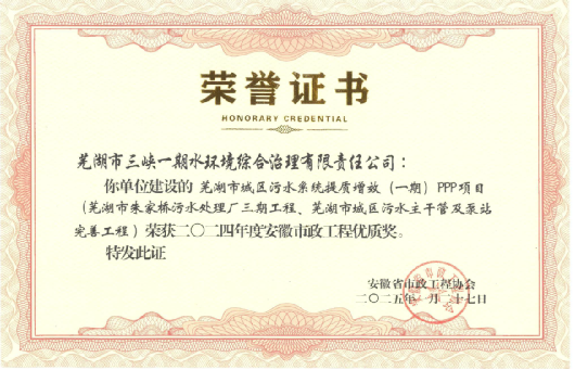 本網訊(雷進發 程威強) 近日,2024年度安徽省市政工程優質獎獲獎項目名單公布,蕪湖水管家公司投資建設的蕪湖市城區污水系統提質增效(一期)項目喜獲2024年度“安徽市政工程優質獎”。